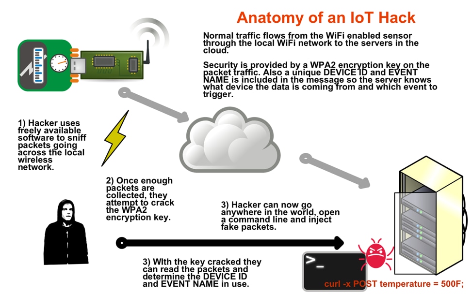 Embedded systems that make up the Internet of Things (IoT) are constantly becoming more powerful from a computing perspective. Still, they are limited when compared to the modern desktop or even smartphone architectures. These limited resources force us to make design choices that might not be the best from a security perspective. To illustrate the inherent risks, we are going to demonstrate how it is possible to inject fake data packets into a sensor’s data stream. What are the inherent strengths and weaknesses of IoT security from a “black hat“ hacker’s perspective? We have not given you enough information to attempt this in the real world, just enough to give you an idea of how this happens. Here goes: