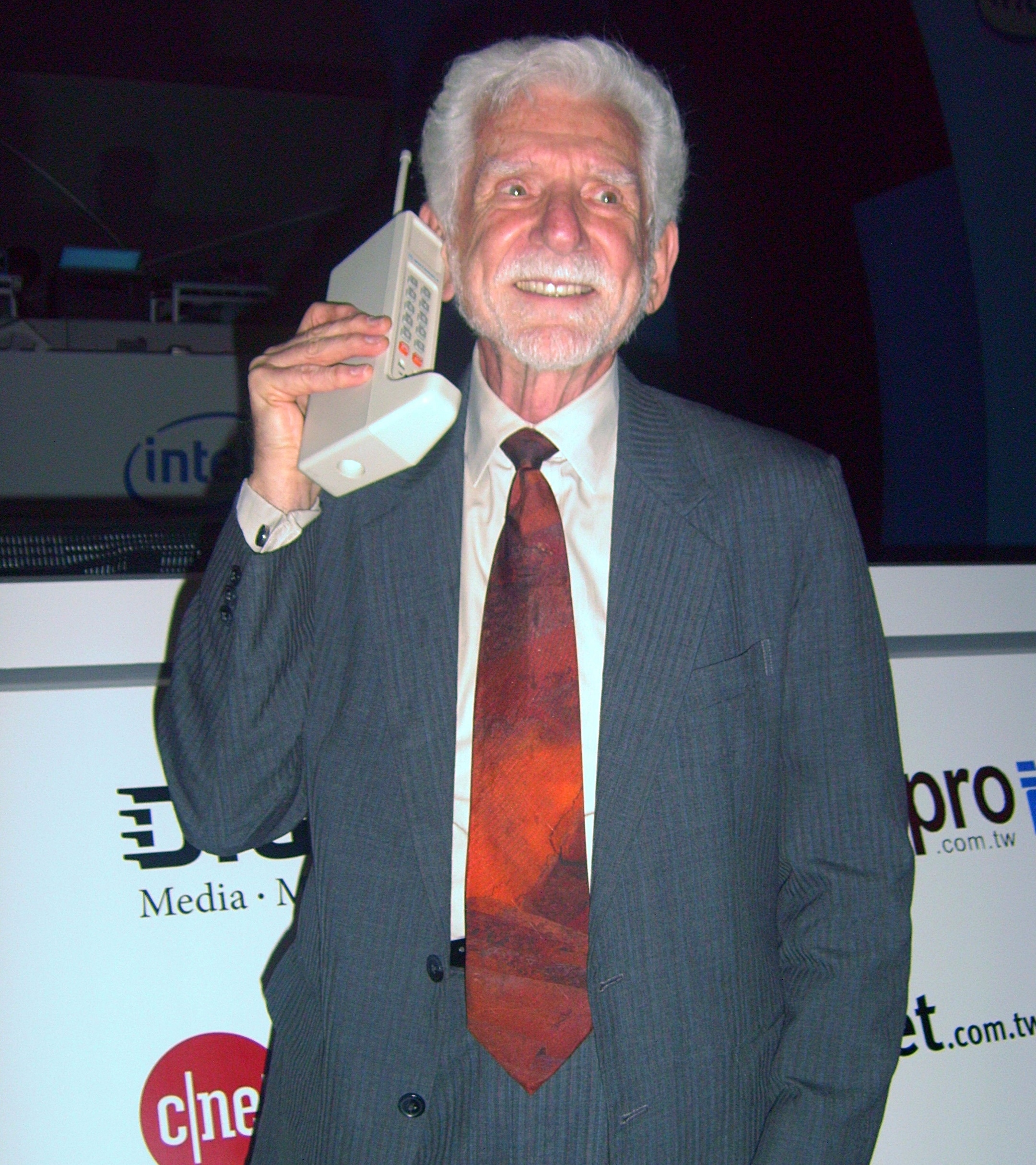 Figure 1: Dr. Martin Cooper poses with the 1973 DynaTAC prototype, the first cell phone. (Source: Rico Shen/CC BY-SA 3.0)
